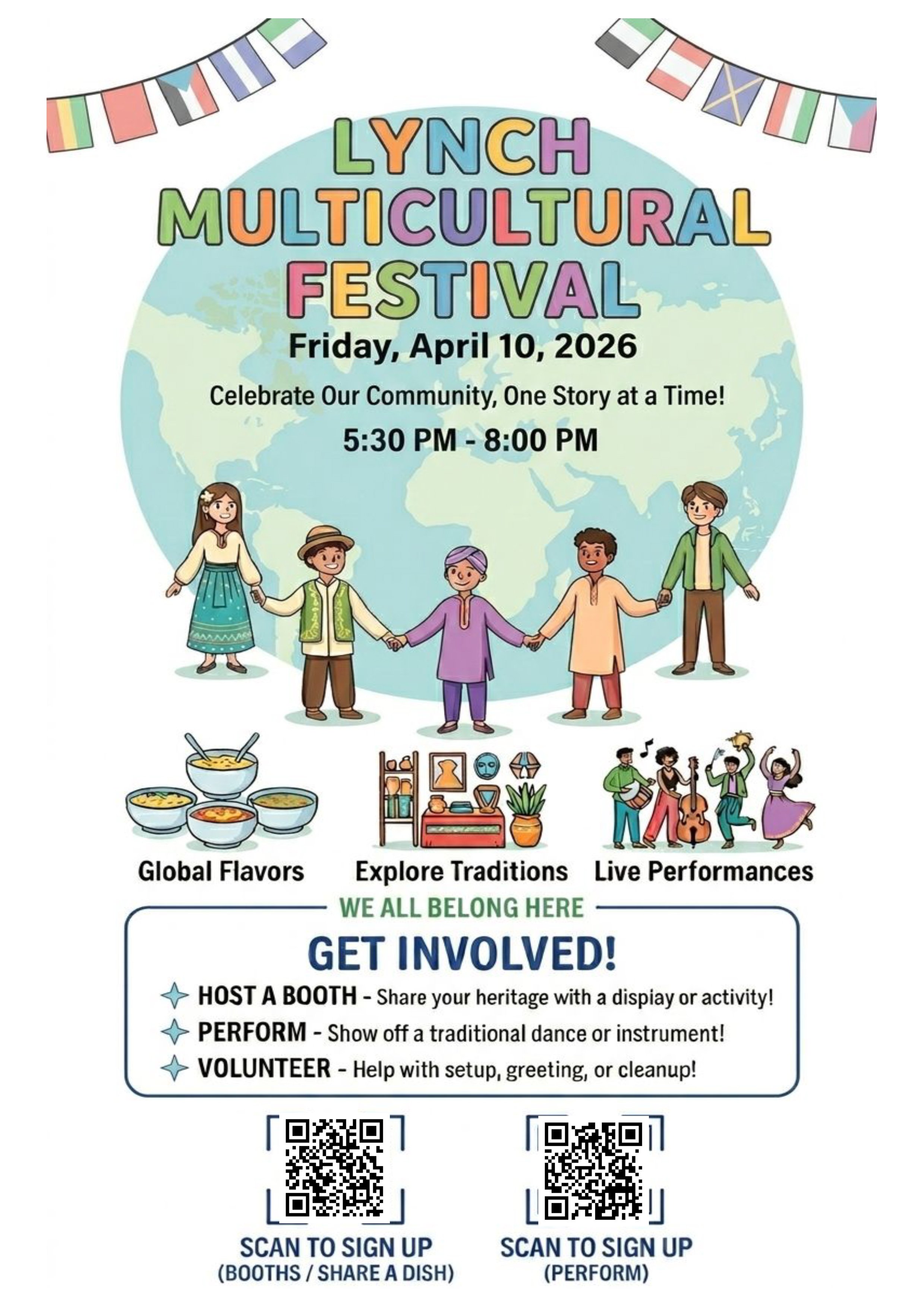 We are excited to invite you to the Lynch Multicultural Festival on April 10th, a celebration of the rich backgrounds that make our school community so special! To make this festival a fun learning experience, we need your help. We are looking for families to sign up by March 13.